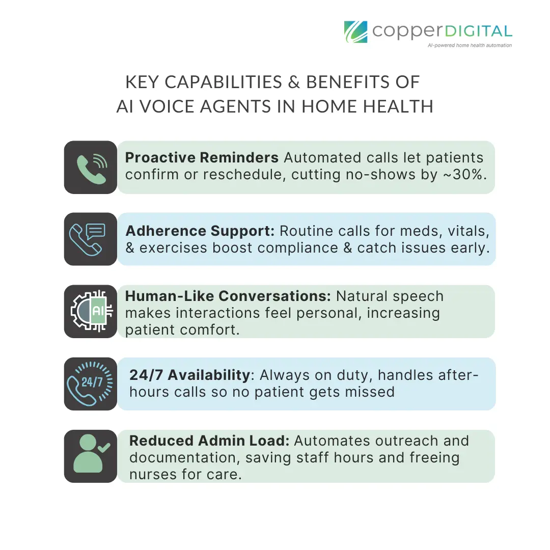 To summarize, here are some of the key capabilities and benefits of AI voice agents in home health: