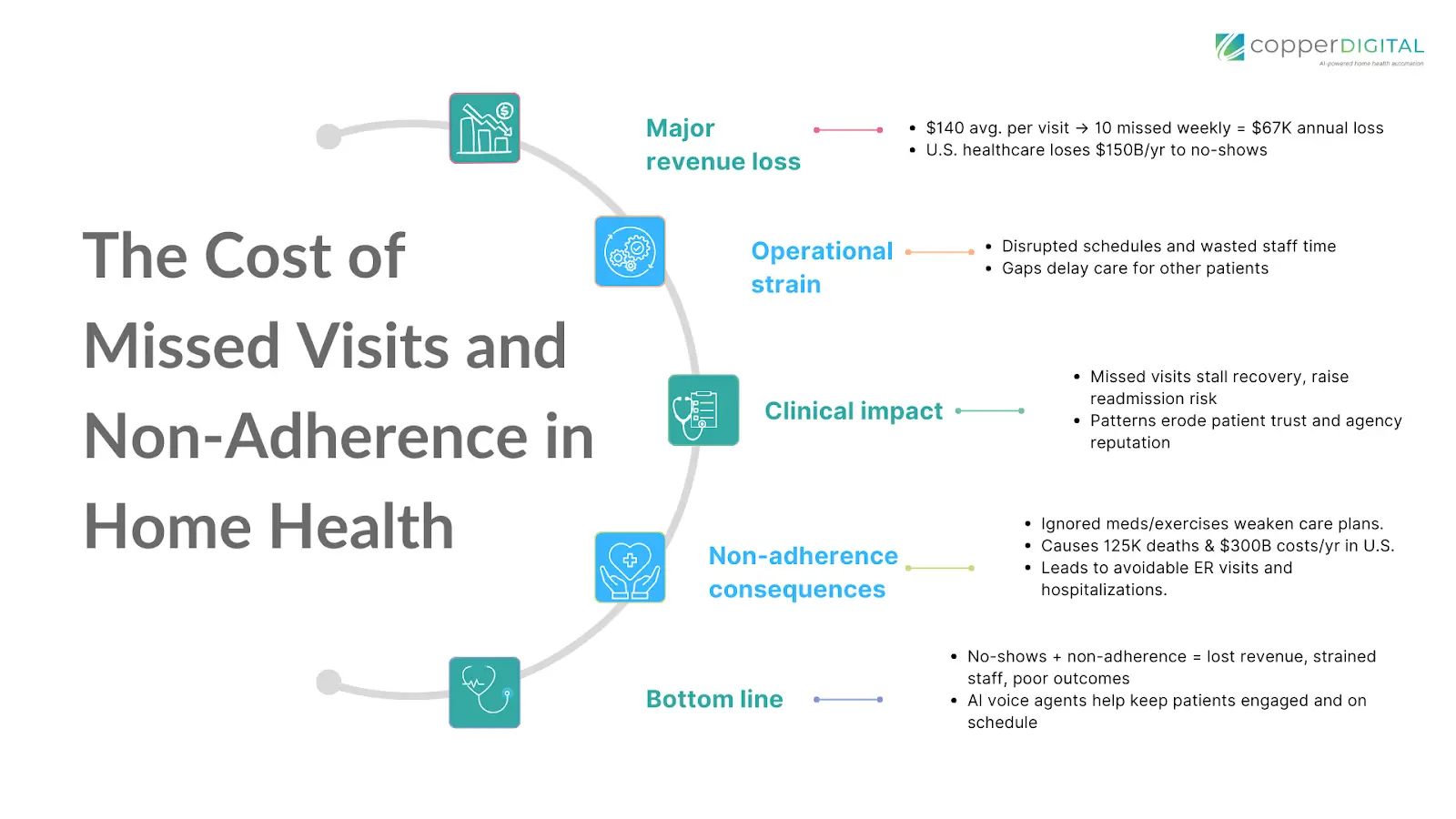 Missed appointments and poor care plan adherence are silent profit-killers in home health. No-shows leave costly gaps in clinicians’ schedules, while patients skipping medications or exercises often land back in the hospital. For U.S. home health agencies already operating on thin margins, these issues carry significant financial and clinical consequences. This post explores the scale of the problem and how AI voice agents – essentially automated phone assistants powered by artificial intelligence – are helping agencies dramatically reduce patient no-shows and improve adherence to care plans. We’ll also spotlight Copper Digital’s “Copper Voice” solution, an AI voice agent built for home health, and the real-world ROI it’s delivering.