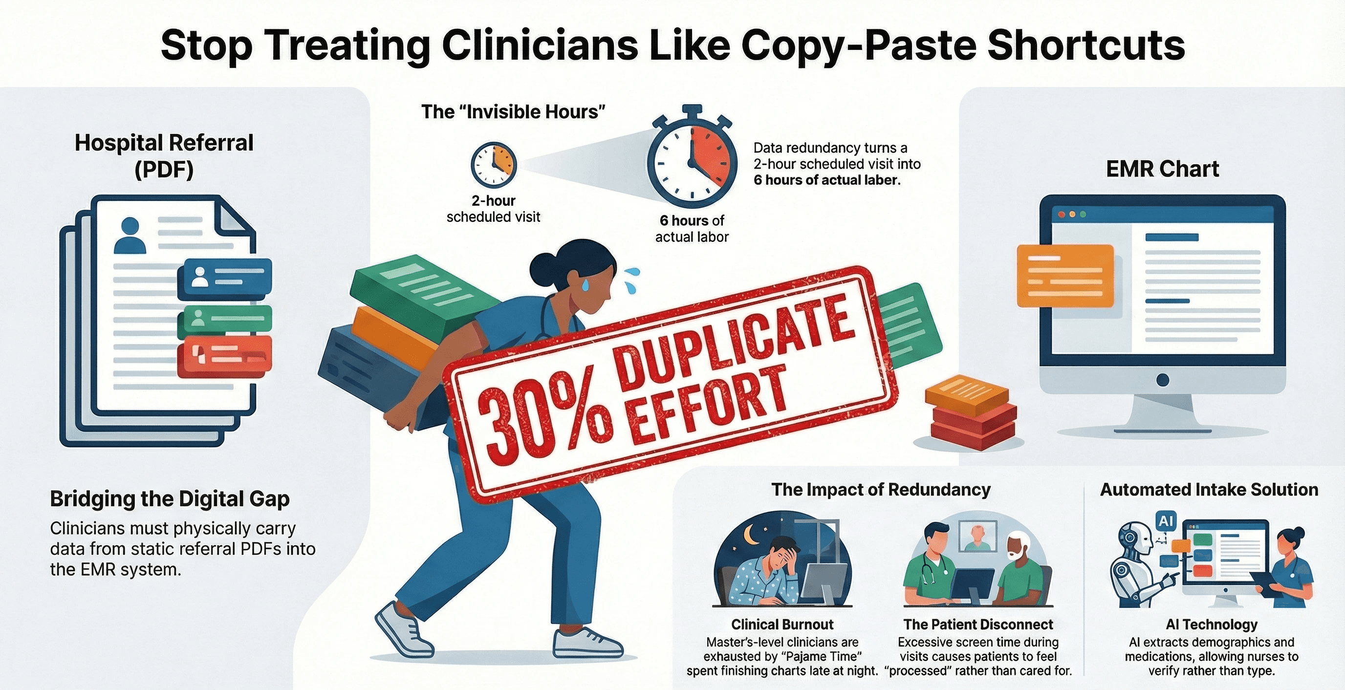 This is Data Redundancy. It is a primary driver of the health worker burnout crisis. We are taking a master 's-level clinician and forcing them to do the work of a copy-paste shortcut.