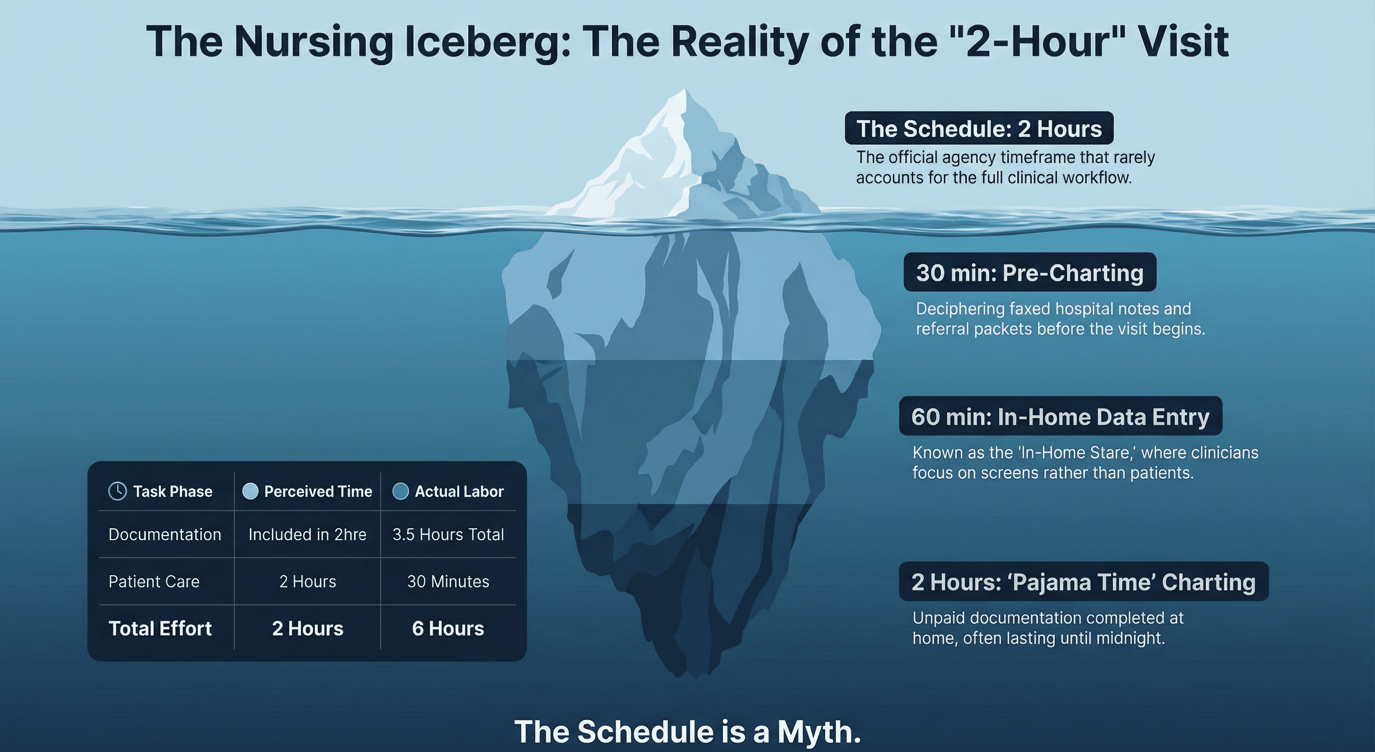 The In-Home "Care" (30 Minutes): This is the work she signed up for. Listening to heart sounds. Assessing the wound. Teaching the patient how to use their new oxygen concentrator. This is the only part of the visit that generates value for the patient.