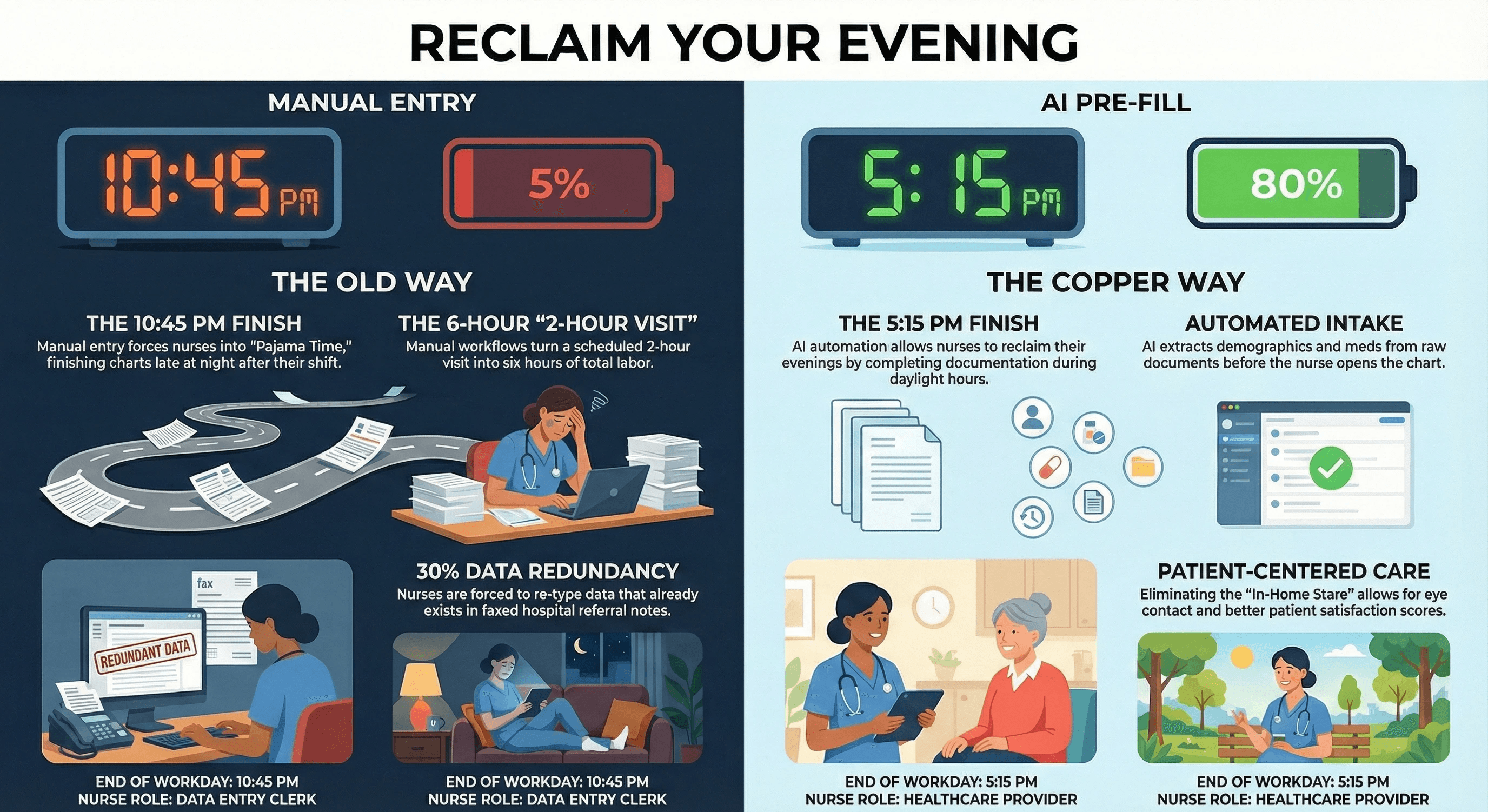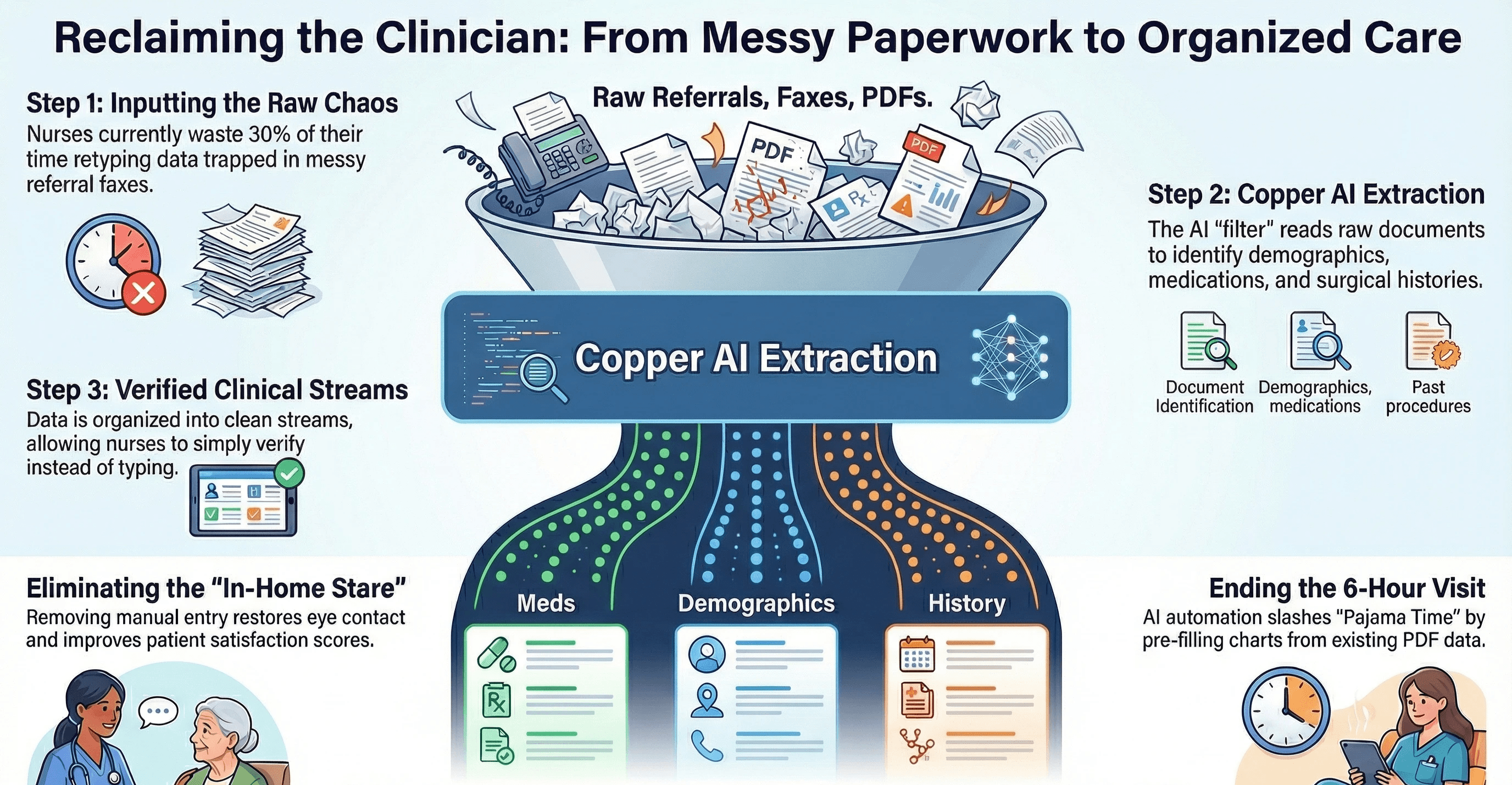 Copper Digital functions as an automated intake coordinator. Our AI reads the raw referral documents before the nurse ever opens the chart.