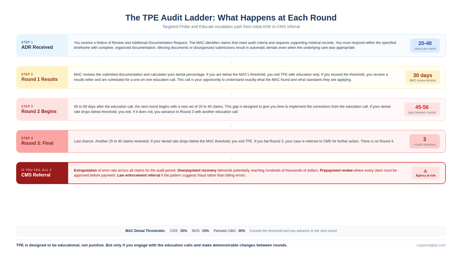 Targeted Probe and Educate is CMS's structured audit program designed to reduce improper payments through education rather than punishment. When your agency is selected for TPE, you receive a Notice of Review and will have 20 to 40 claims reviewed per round. At the end of each round, you receive a calculated denial percentage. Each MAC has a threshold: CGS requires you to be under 25%, NGS under 15%, and Palmetto GBA under 20%. If your denial rate exceeds the threshold, you advance to the next round. After a failed round, the MAC schedules an education call, and the next round begins 45 to 56 days later. If you fail all three rounds, you are referred to CMS for further action, which can include extrapolation and overpayment demands, prepayment review, or referral to law enforcement.