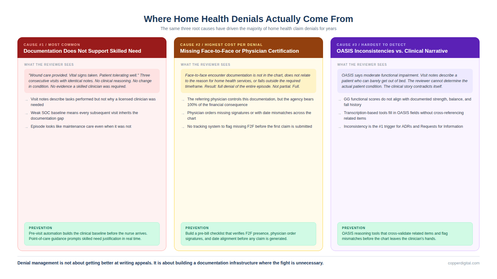 The top three denial triggers in home health are documentation that does not clearly support medical necessity or skilled need, missing or incomplete physician certification and face-to-face encounter documentation, and OASIS scoring inconsistencies that contradict the clinical narrative. These three categories account for the majority of Traditional Medicare denials and have remained consistent over multiple years of TPE audit data.
