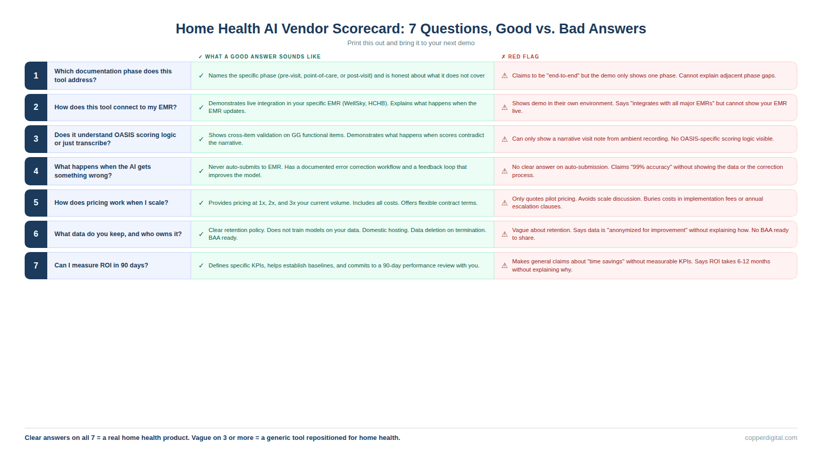 Every home health AI vendor will tell you their product saves time, reduces denials, and improves outcomes. Most of those claims are directionally true but operationally vague. This guide gives you seven specific questions to ask during every demo, what a good answer looks like, what a bad answer looks like, and how to tell when a vendor is selling you a generic tool dressed up in home health language. The questions cover which documentation phase the tool addresses, how it connects to your EMR, whether it understands OASIS scoring logic or just transcribes, what happens when the AI gets something wrong, how pricing works at scale, what data the vendor keeps, and whether you can actually measure ROI in the first 90 days. Print this out before your next demo.