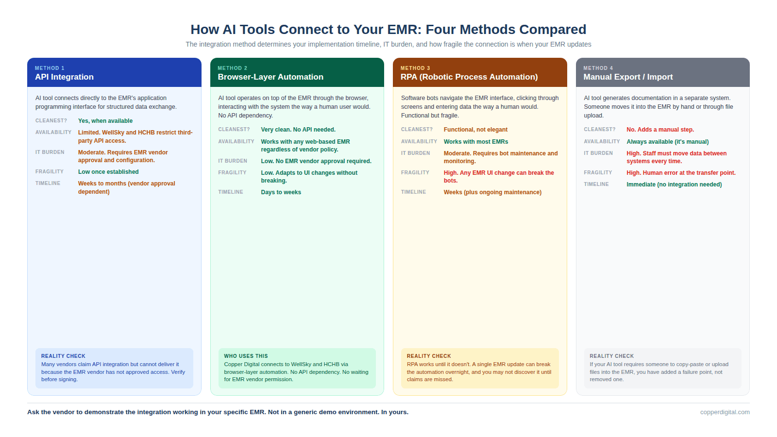 There are four common integration methods: API integration (cleanest but often limited by EMR vendor access policies), browser-layer automation (operates on top of the EMR without API dependency, which is how Copper Digital connects), RPA (robotic process automation that is functional but brittle when the EMR interface changes), and manual export/import (adds a step and a failure point). Ask the vendor to demonstrate the integration working in your specific EMR, not in a generic demo environment.