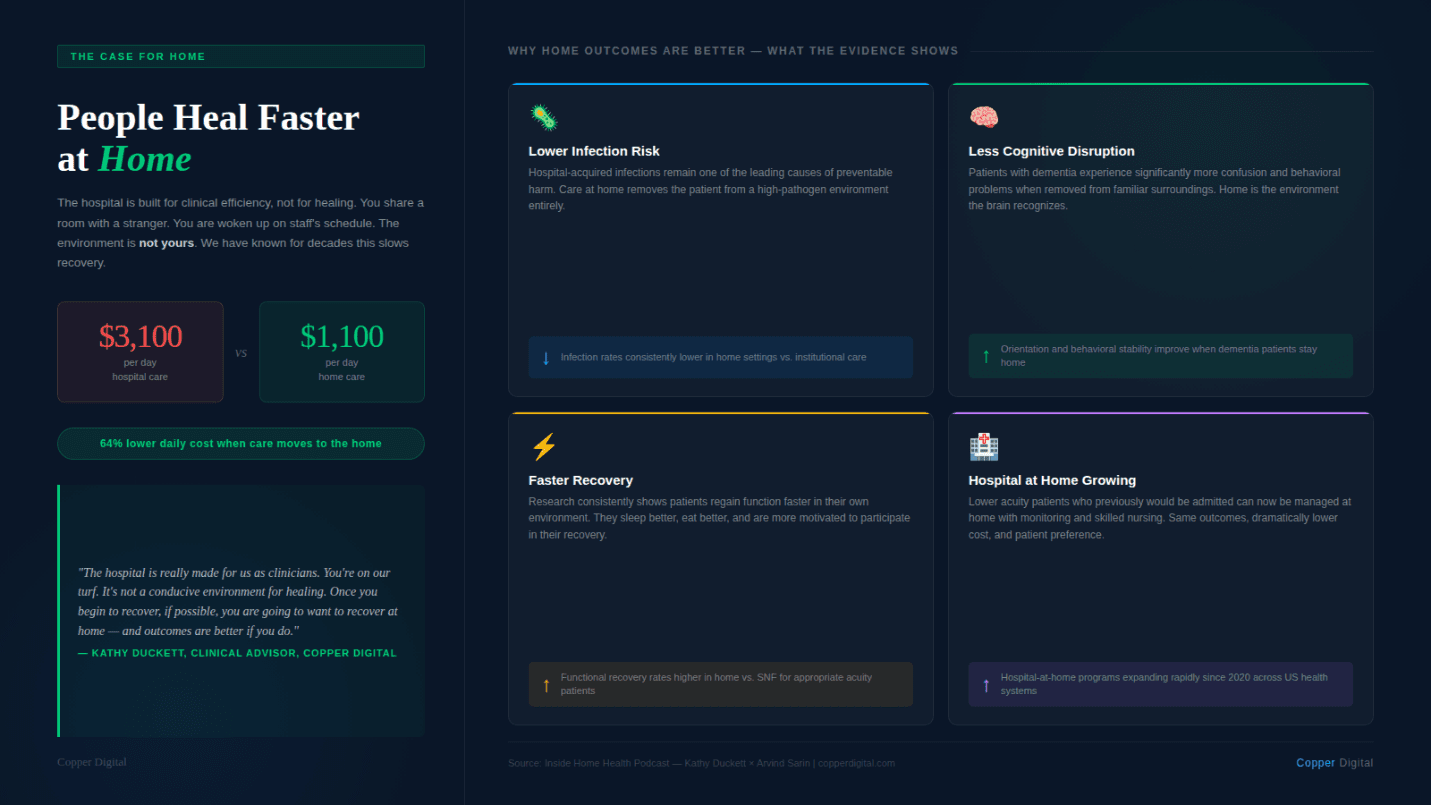 There is solid evidence behind the push to move care out of hospitals and into home settings. Patients heal faster in their own environment. Infection rates are significantly lower at home than in institutional settings. Patients with dementia experience considerably less confusion and behavioral disruption when they are cared for in a familiar environment rather than displaced to a hospital.