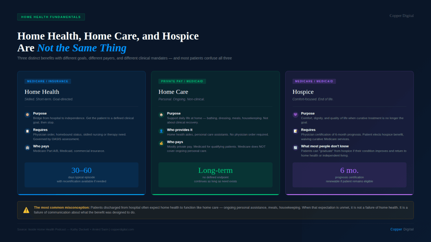 More than 30 years later, I am doing the most interesting work of my career. I joined Copper Digital as a clinical advisor to help shape AI tools for home health documentation. When Arvind asked me to join the Inside Home Health podcast and talk about why home health matters, I realized how much confusion still exists, even among people who work adjacent to the industry, about what home health actually is, what it is designed to do, and why getting the documentation right is so consequential.