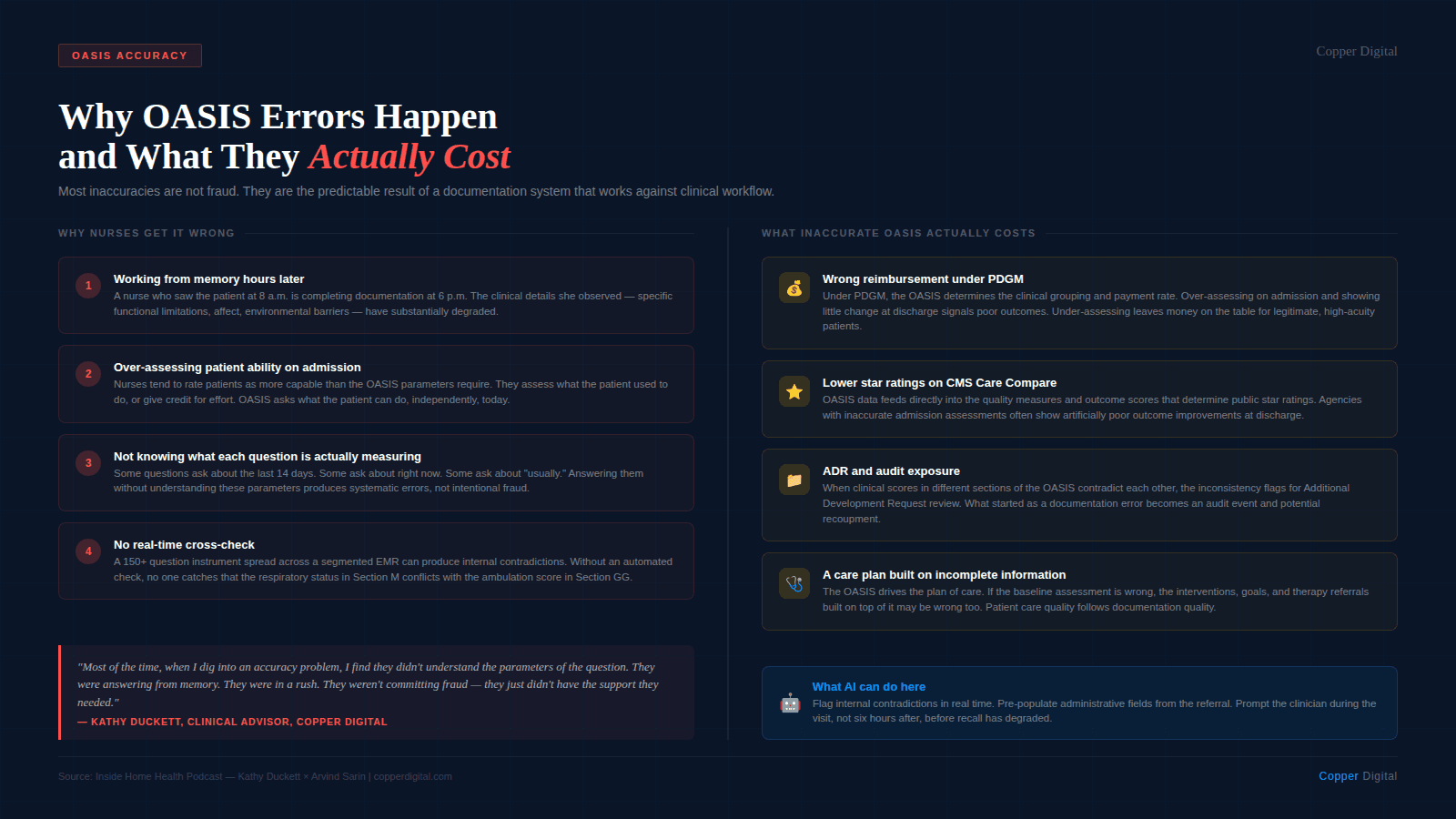 Listen to the full conversation with Arvind Sarin on the Inside Home Health podcast series at copperdigital.com/blog/inside-home-health. To see how Copper Digital is building AI agents that support home health documentation and OASIS accuracy, request a demo. |