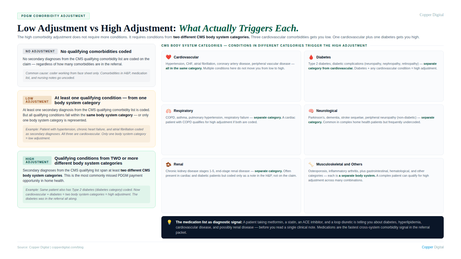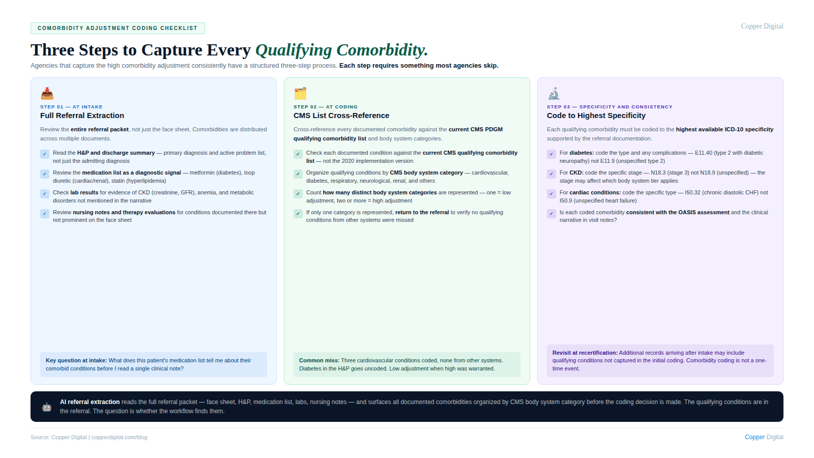 Copper Digital extracts diagnosis and comorbidity information from the full referral packet at intake, cross-references qualifying conditions against the PDGM comorbidity list and body system categories, and surfaces the high comorbidity adjustment opportunity before the coding decision is made. Request a demo to see how this works in your agency's intake workflow. |