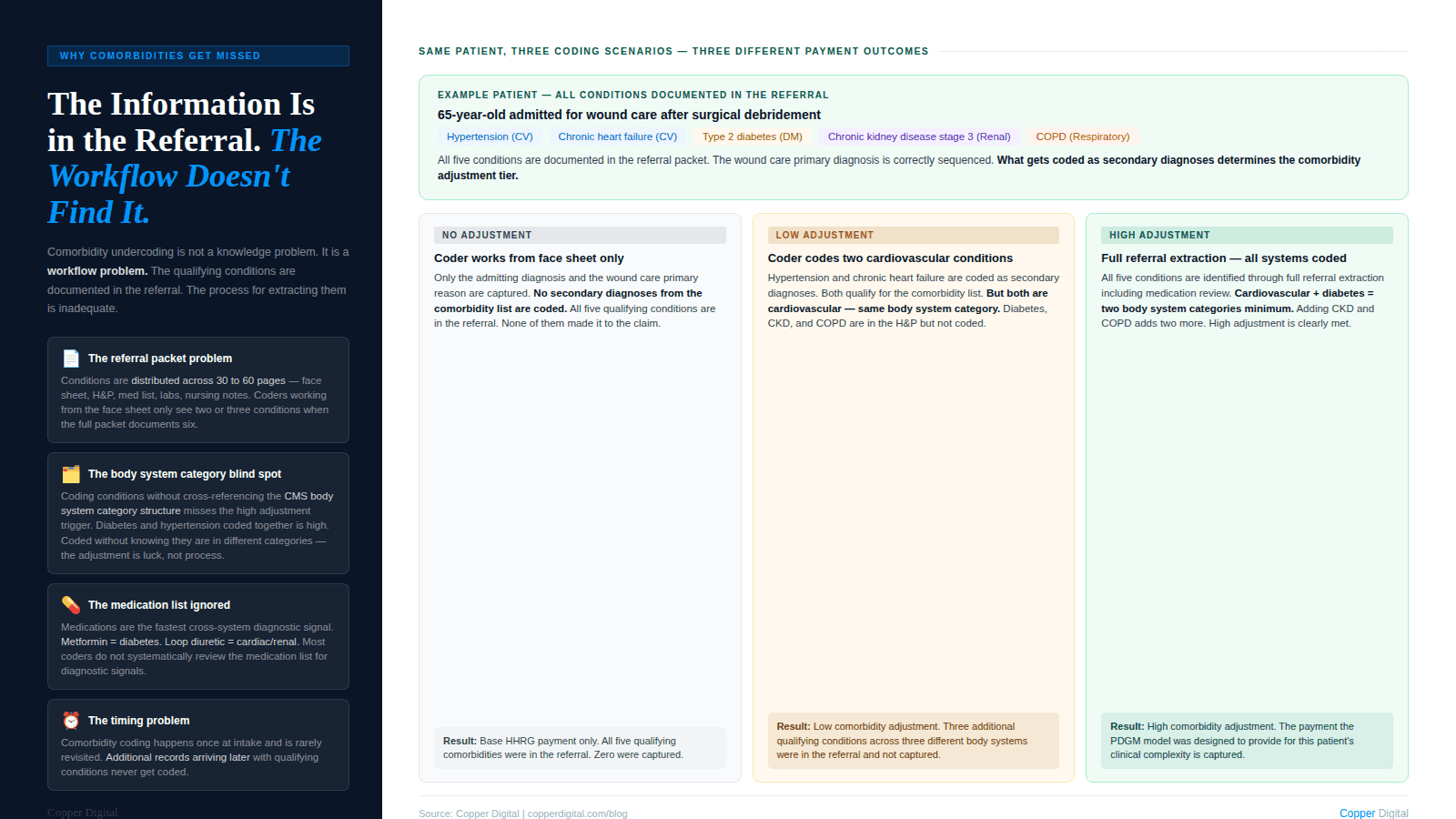 Home health referrals arrive as multi-page documents. A medically complex patient discharged from an acute care setting can generate a referral packet of 30 to 60 pages including physician orders, discharge summaries, medication reconciliation lists, lab results, imaging reports, and nursing notes. The comorbid conditions that would qualify for the high comorbidity adjustment are distributed across these documents. The admitting diagnosis appears on the face sheet. The diabetes appears in the H&P. The chronic kidney disease appears in the lab results. The neuropathy appears in the nursing notes. If the coder is working from the face sheet, they code two conditions. If they work from the full packet, they may code five or six. This is the same referral extraction problem that drives primary diagnosis sequencing errors. The comorbidity adjustment failure is a downstream consequence of the same root cause.