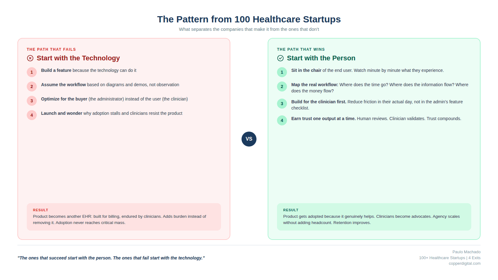 The startups that succeed start with the person they are building for. They sit in the chair of the end user and understand minute-by-minute what that person experiences. The ones that fail start with the technology and assume adoption will follow. After working with over 100 healthcare startups, this pattern has never changed. The first question should always be: What does the end user actually see, feel, and do?