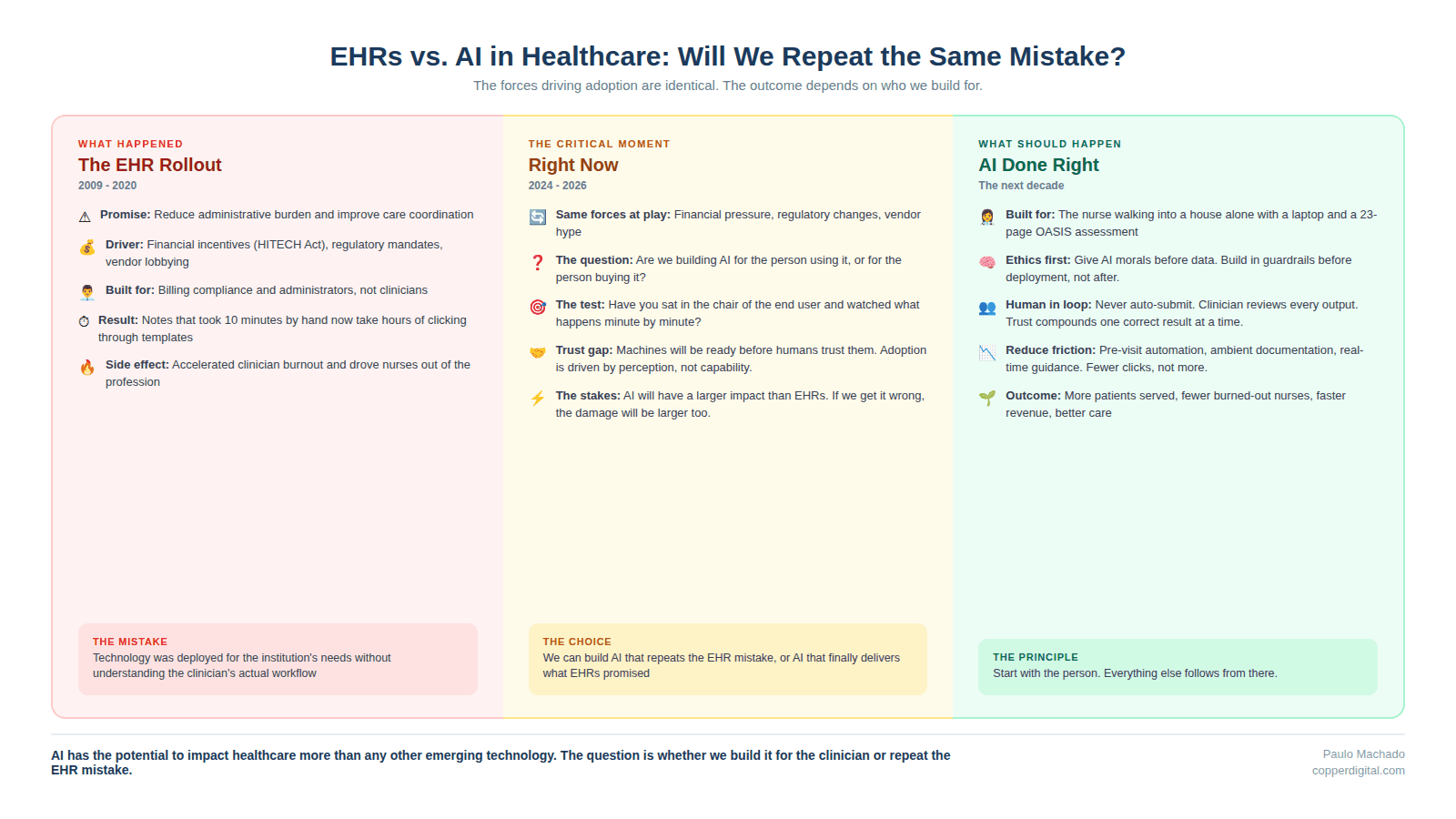 Yes. AI has the potential to impact healthcare more than any other emerging technology, including electronic health records. But the risk is repeating the same mistakes. EHRs were built for billing compliance, not clinician workflows, and became the administrative burden they were supposed to eliminate. AI companies that build for the end user's actual experience rather than for compliance checklists will avoid this pattern. Copper Digital's approach of building pre-visit automation around what the nurse actually sees is an example of getting this right.