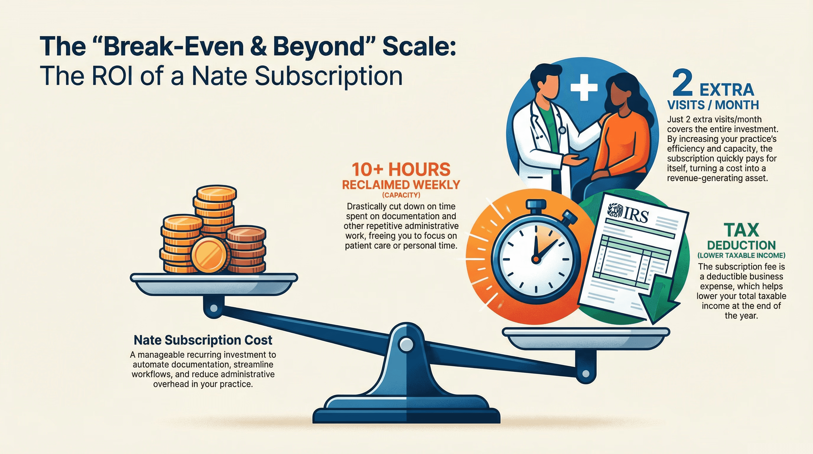 Consider the economics of volume. By reclaiming over 10 hours of documentation time weekly, you create capacity in your schedule. You do not need to fill all those hours to see a return. Using the time saved to accept just two extra visits per month covers the investment entirely. Every visit after that is pure profit.
