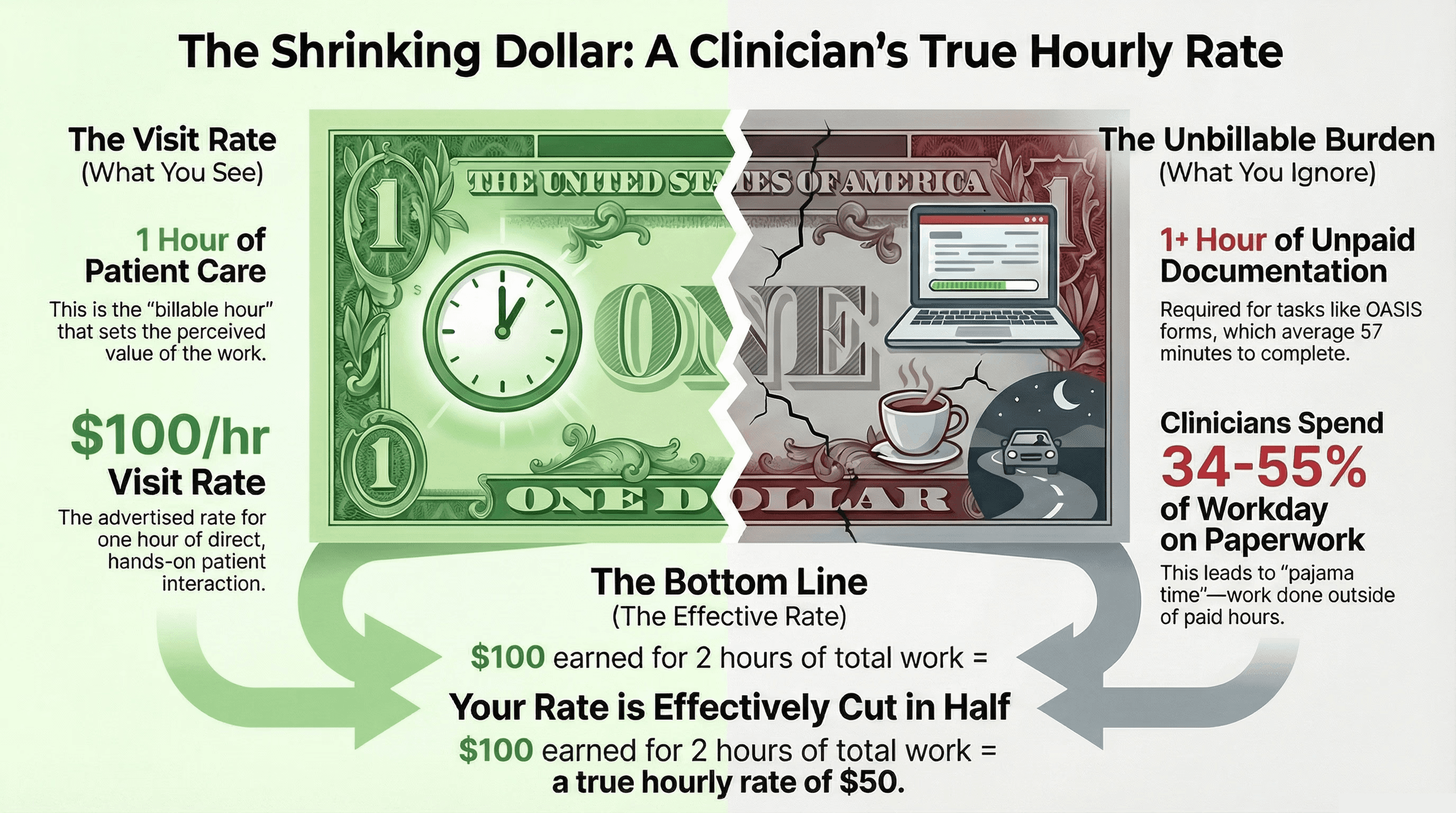 When you accept a contract, you likely calculate your earnings based on the visit rate. However, this calculation is often deceptive. It fails to account for the hours spent typing OASIS notes in your car or at your kitchen table. Every minute spent on documentation is a minute you are working for free. If you earn a premium rate for a visit but spend an equal amount of time charting unpaid, your effective hourly rate is immediately cut in half.