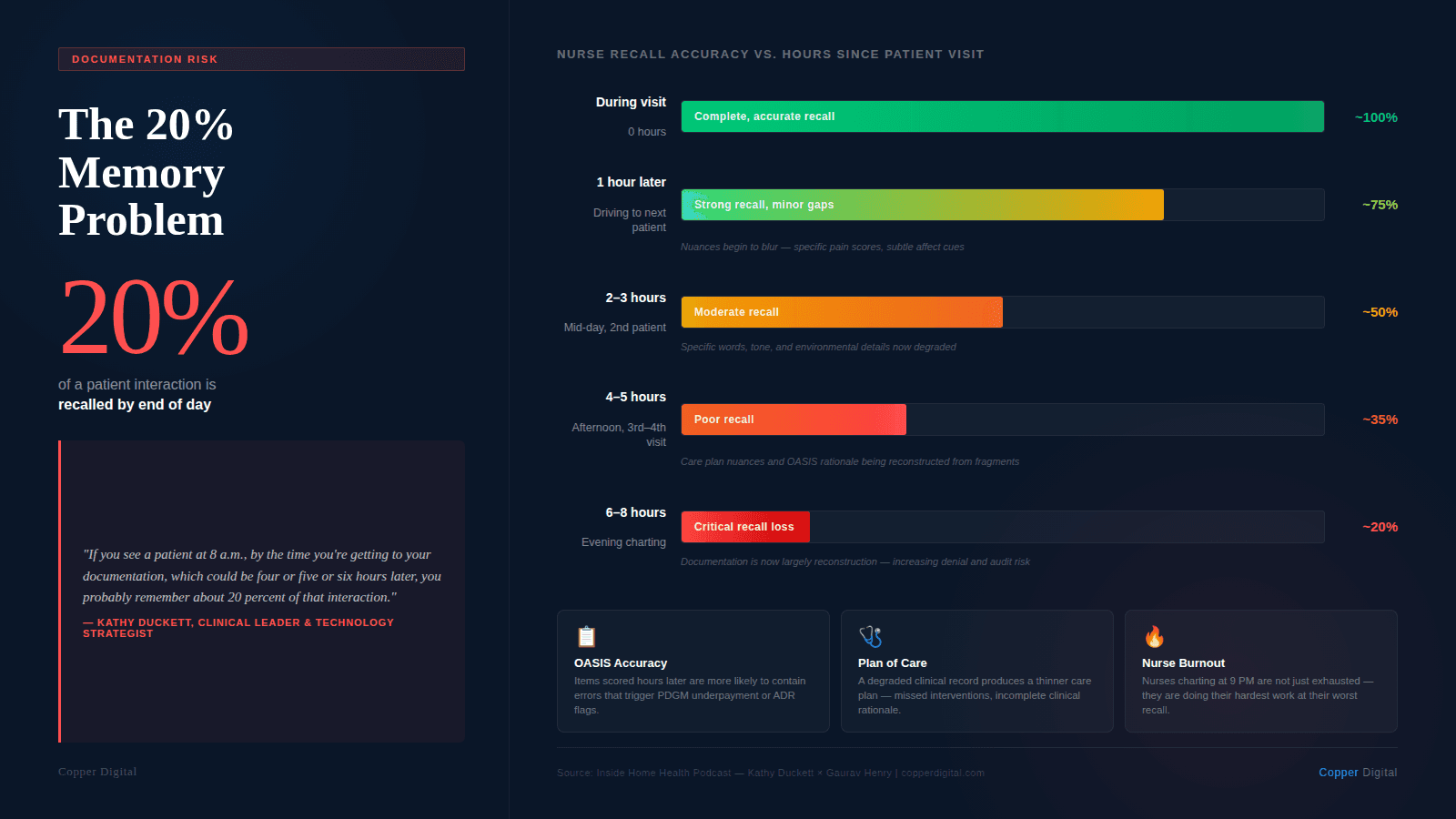 Kathy referenced studies on clinical memory that should concern every agency owner: the farther away you get from the moment of assessment, the less you remember. If a nurse sees a patient at eight in the morning and does not finish her documentation until four or five in the afternoon, she is working from roughly 20 percent of what she actually observed.