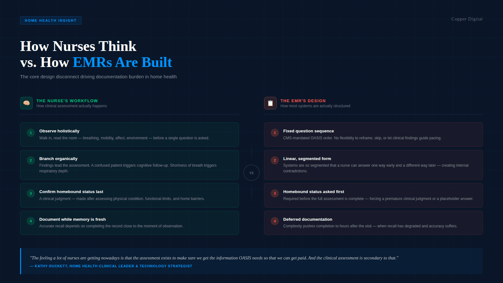 When the system is built the wrong way around, you get charts that are technically complete and clinically thin. The OASIS fields are populated, but the nuances that would inform a genuinely individualized care plan are not there. Not because the nurse did not observe them, but because the system did not make space for them. As Kathy put it: "If I'm just being compliant, answering A through G, but not using the critical thinking nurses are educated to do, then I'm filling out the paperwork, but I'm not necessarily taking care of the patient. And you have to do both."